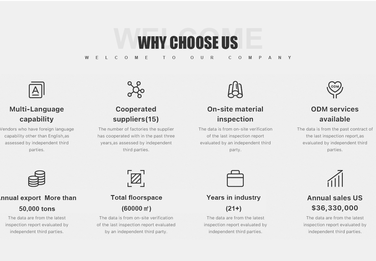 Cooperated suppliers (15)Total floorspace (652㎡)Years in industry(6)Annual sales US $9,000,000